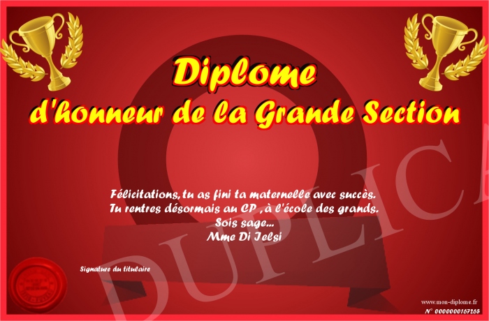 Envoyez par email votre Diplôme d'honneur de la Grande Section personalisé