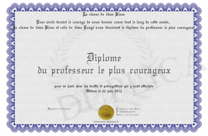 Envoyez par email votre Diplôme du professeur le plus courageux personalisé