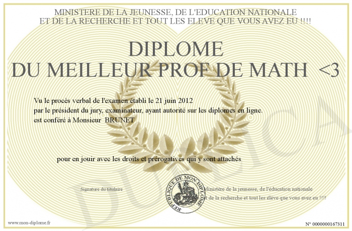 Envoyez par email votre Diplôme du meilleur prof de math -3 personalisé