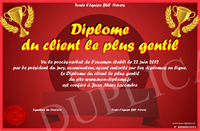 Envoyez par email votre Diplôme du client le plus gentil personalisé