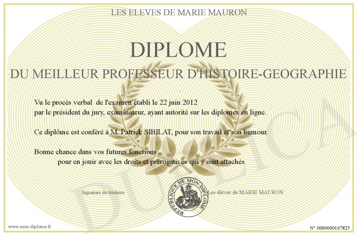 Envoyez par email votre Diplôme du meilleur professeur d'Histoire-Géographie personalisé