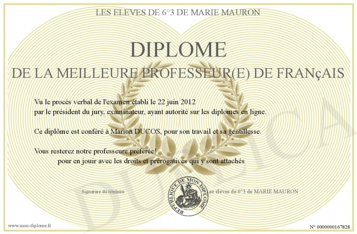 Envoyez par email votre Diplôme de la meilleure professeur(e) de Français personalisé