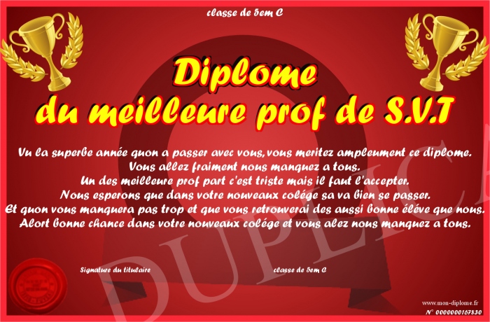 Envoyez par email votre Diplôme du meilleure prof de S.V.T personalisé