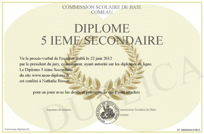Envoyez par email votre Diplôme 5 ième Secondaire personalisé