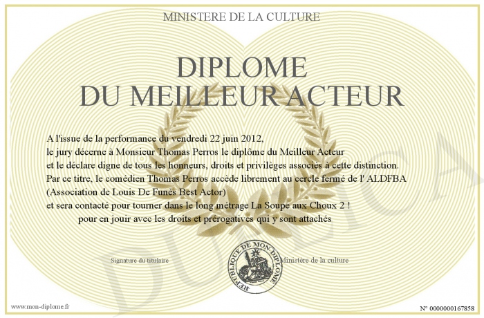 Envoyez par email votre Diplôme du Meilleur Acteur personalisé