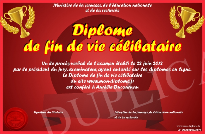 Envoyez par email votre Diplôme de fin de vie célibataire personalisé