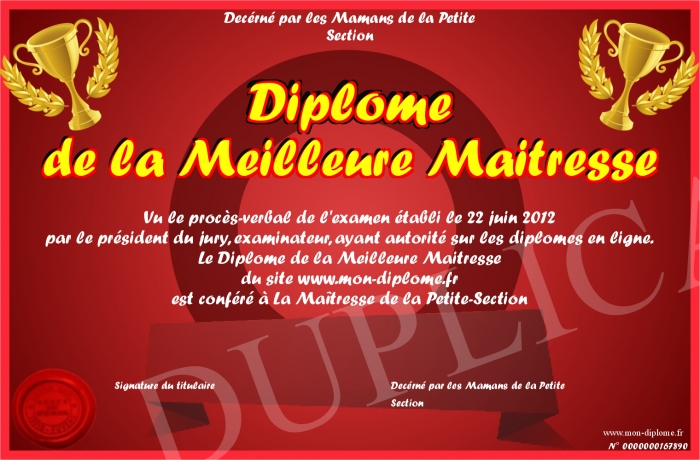 Envoyez par email votre Diplome de la Meilleure Maitresse personalisé