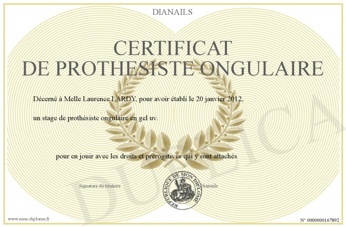 Envoyez par email votre Certificat de Prothesiste ongulaire personalisé