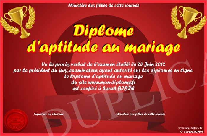 Envoyez par email votre Diplôme d'aptitude au mariage personalisé