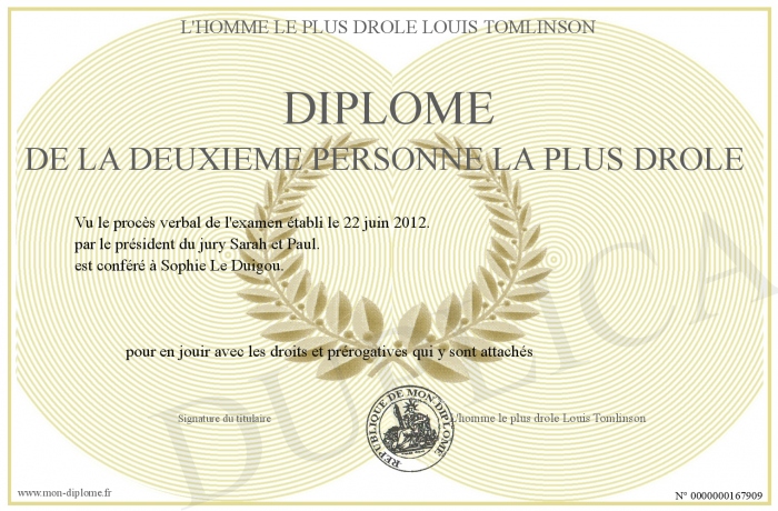 Envoyez par email votre Diplôme de la deuxième personne la plus drole personalisé
