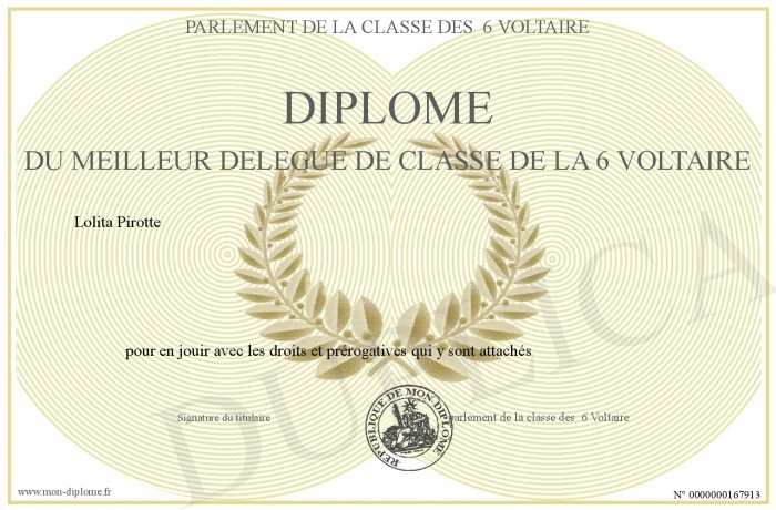 Envoyez par email votre Diplôme du meilleur delegue de classe de la 6 Voltaire personalisé