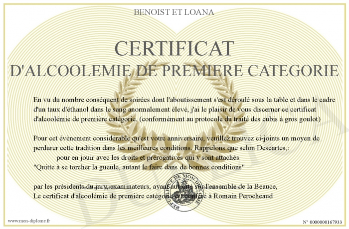 Envoyez par email votre Certificat d'Alcoolémie de première catégorie personalisé