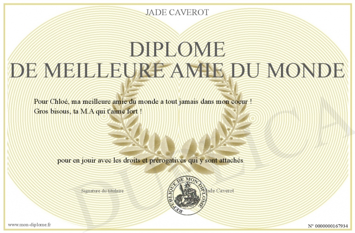 Envoyez par email votre Diplôme de meilleure amie du monde personalisé