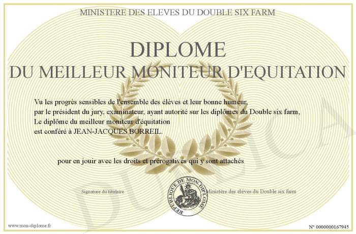Envoyez par email votre Diplôme du meilleur moniteur d'équitation personalisé