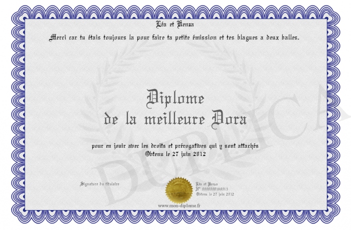 Envoyez par email votre Diplome de la meilleure Dora personalisé