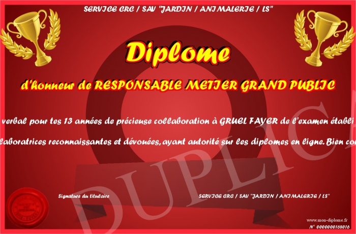 Envoyez par email votre Diplôme d'honneur de RESPONSABLE METIER GRAND PUBLIC personalisé