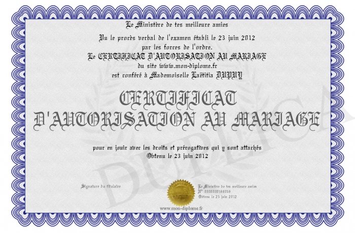 Envoyez par email votre CERTIFICAT D'AUTORISATION AU MARIAGE personalisé