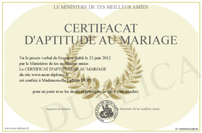 Envoyez par email votre CERTIFACAT D'APTITUDE AU MARIAGE personalisé