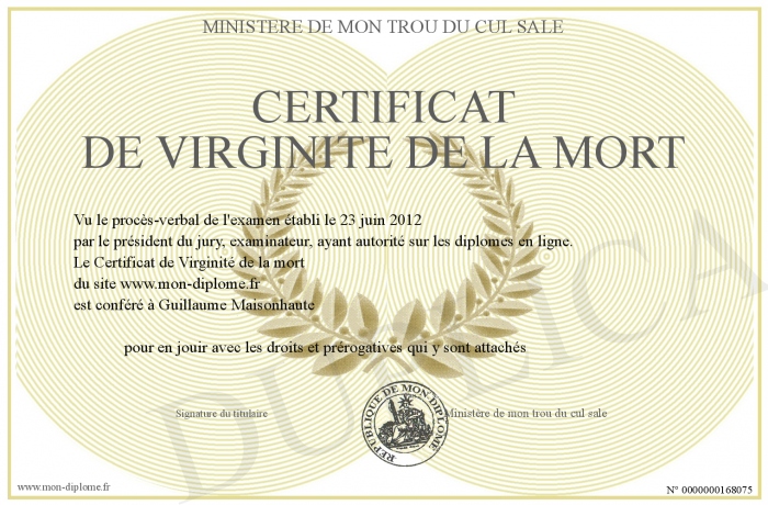 Envoyez par email votre Certificat de Virginité de la mort personalisé