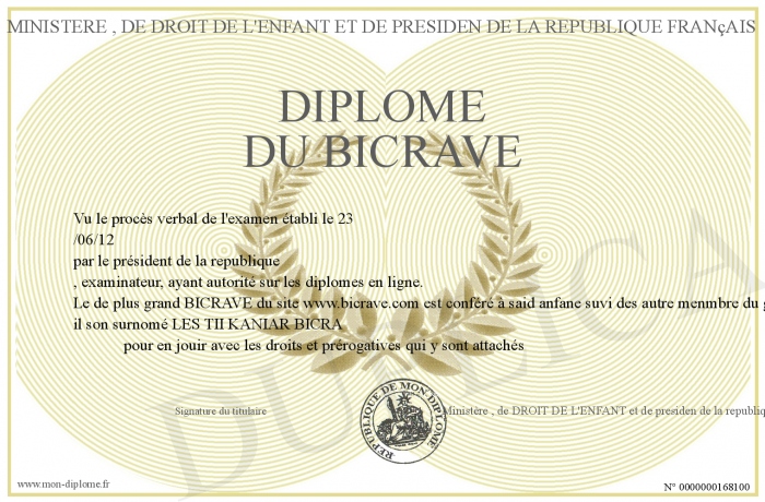 Envoyez par email votre Diplôme du BICRAVE personalisé
