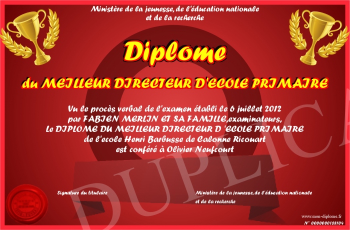 Envoyez par email votre Diplôme du MEILLEUR DIRECTEUR D'ECOLE PRIMAIRE personalisé
