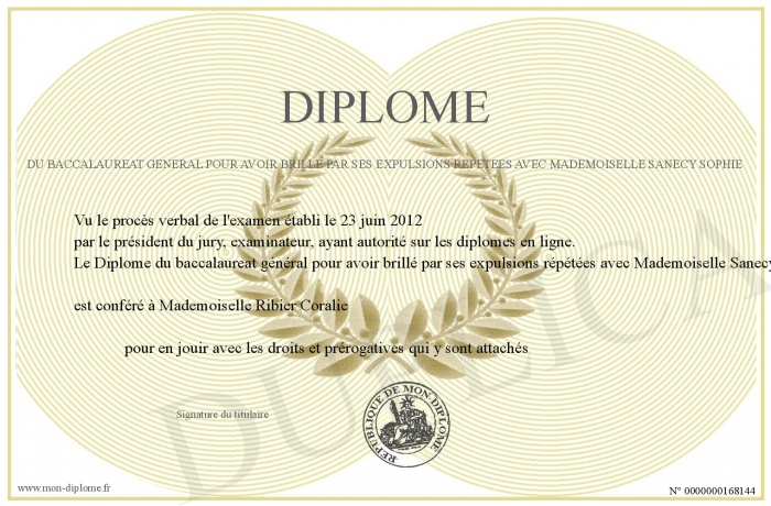 Envoyez par email votre Diplôme du baccalaureat général pour avoir brillé par ses expulsions répétées avec Mademoiselle Sanecy Sophie personalisé