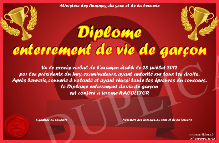 Envoyez par email votre Diplôme enterrement de vie de garçon personalisé
