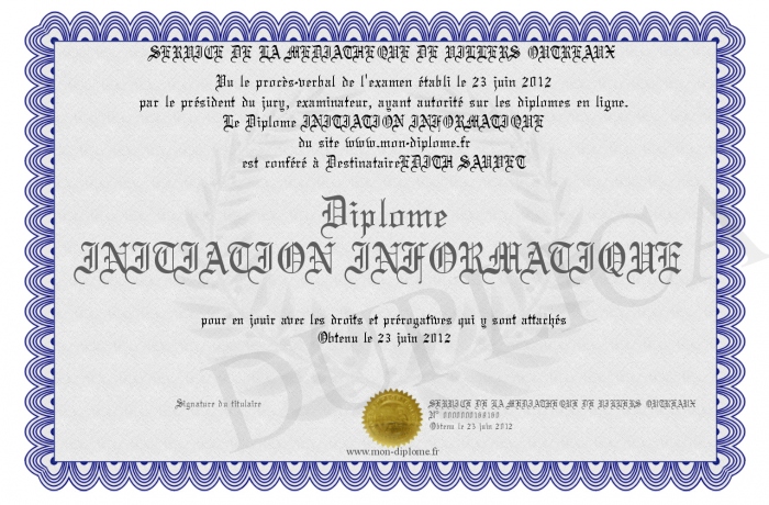 Envoyez par email votre Diplôme INITIATION INFORMATIQUE personalisé