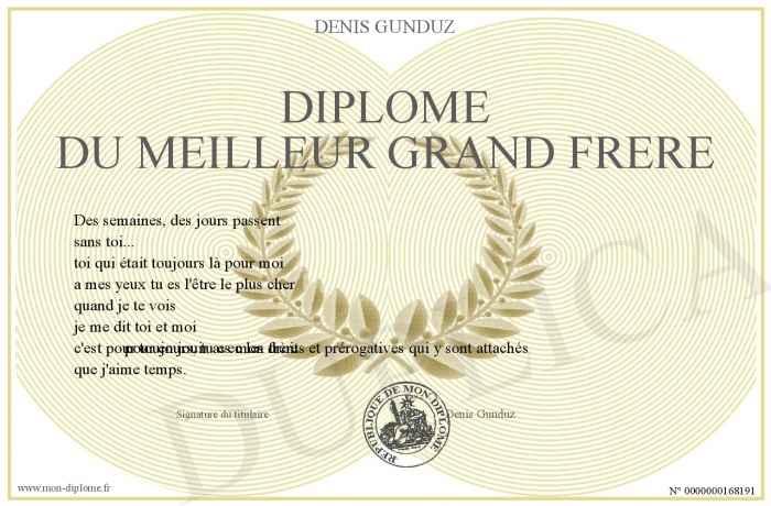 Envoyez par email votre Diplôme du meilleur grand frère personalisé