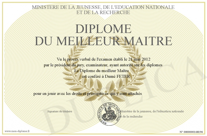 Envoyez par email votre Diplôme du Meilleur MAITRE personalisé
