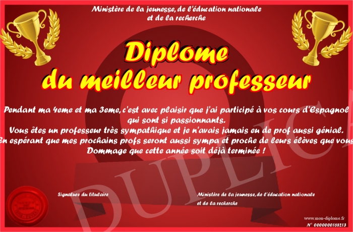 Envoyez par email votre Diplôme du meilleur professeur personalisé