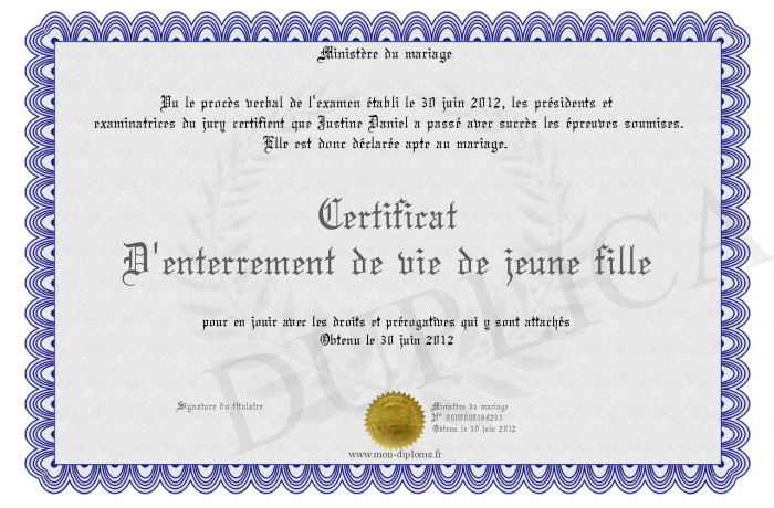 Envoyez par email votre Certificat D'enterrement de vie de jeune fille personalisé