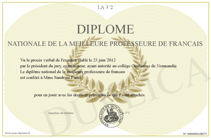 Envoyez par email votre Diplôme nationale de la meilleure professeure de francais personalisé