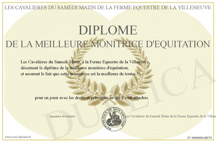 Envoyez par email votre Diplôme de la meilleure monitrice d'Equitation personalisé
