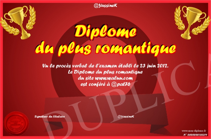 Envoyez par email votre Diplôme du plus romantique personalisé