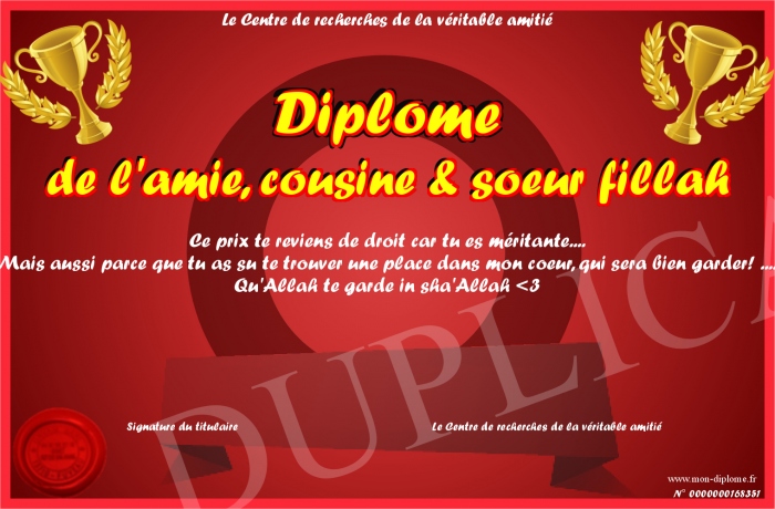 Envoyez par email votre Diplôme de l'amie, cousine & soeur fillah personalisé