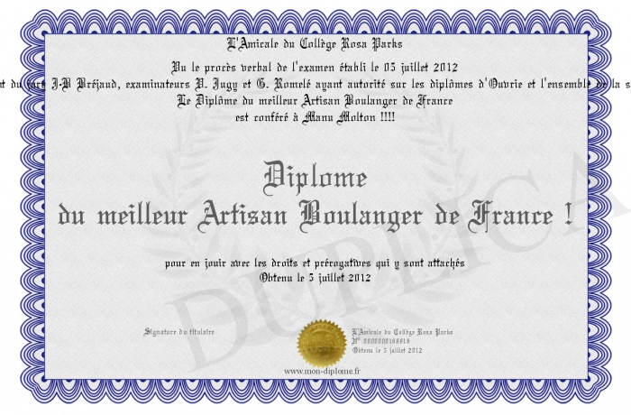 Envoyez par email votre Diplôme du meilleur Artisan Boulanger de France ! personalisé