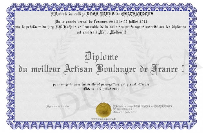 Envoyez par email votre Diplôme du meilleur Artisan Boulanger de France ! personalisé