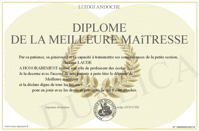 Envoyez par email votre Diplôme de la meilleure maîtresse personalisé