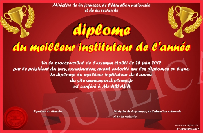 Envoyez par email votre diplome du meilleur instituteur de l'année personalisé