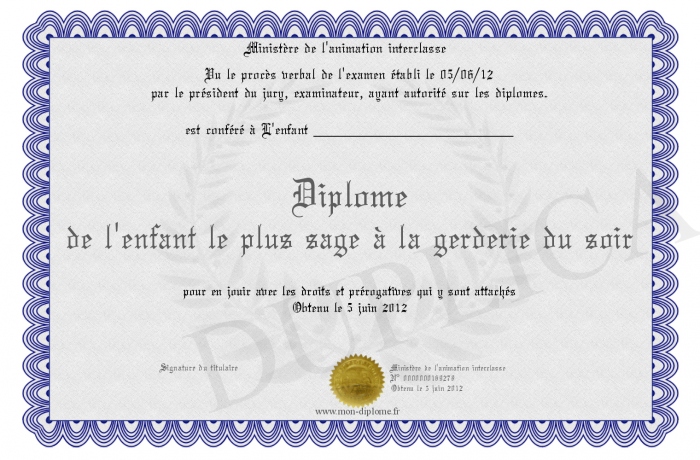 Envoyez par email votre Diplôme de l'enfant le plus sage à la gerderie du soir personalisé