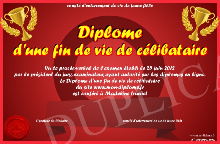 Envoyez par email votre Diplôme d'une fin de vie de célibataire personalisé