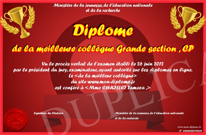 Envoyez par email votre Diplôme de la meilleure collègue Grande section , CP personalisé