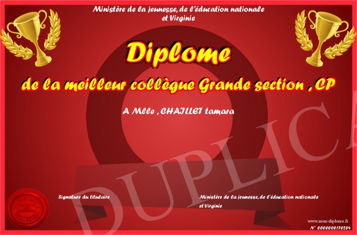 Envoyez par email votre Diplôme de la meilleur collègue Grande section , CP personalisé