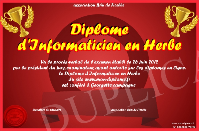 Envoyez par email votre Diplôme d'Informaticien en Herbe personalisé