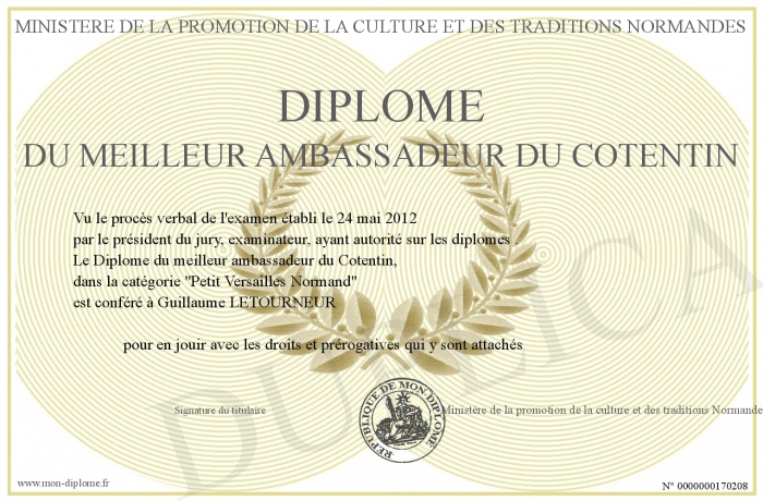 Envoyez par email votre Diplôme du meilleur ambassadeur du Cotentin personalisé