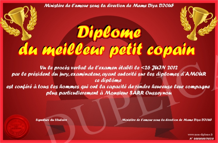 Envoyez par email votre Diplôme du meilleur petit copain personalisé