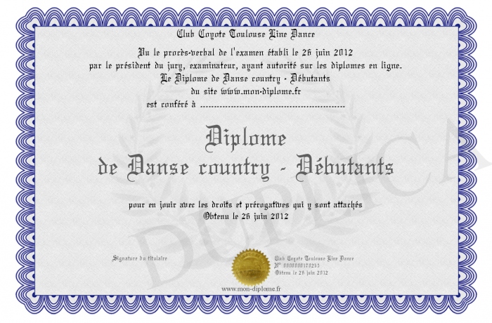 Envoyez par email votre Diplôme de Danse country - Débutants personalisé