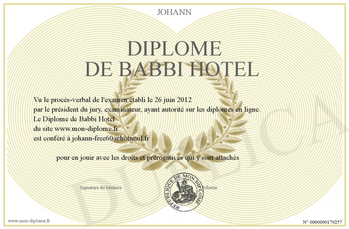 Envoyez par email votre Diplôme de Babbi Hotel personalisé