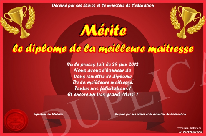 Envoyez par email votre Mérite le diplome de la meilleure maitresse personalisé